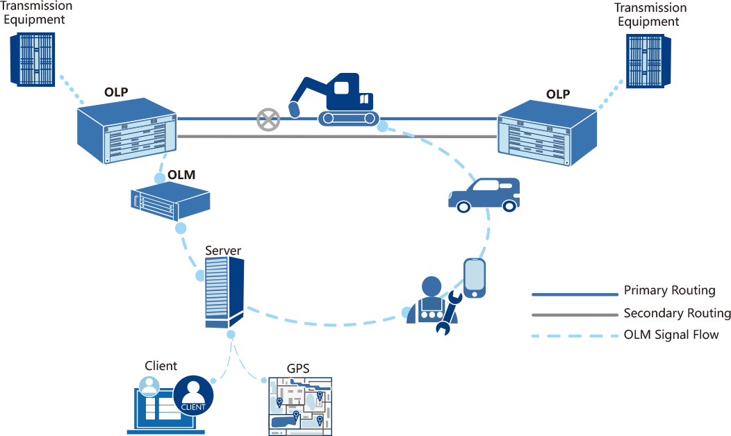 The optical cable O&M solution integrates an optical line protection system (OLP) and an optical line monitoring system (OLM). When the fiber attenuation of the transmission line becomes large or the fiber accidentally breaks, leading to communication quality degradation or communication interruption, the optical line protection system can quickly and automatically switch the primary routing to the secondary routing, and at the same time, the OLM system can quickly and accurately locate the fault point, thus ensuring the normal operation of the communication line and greatly shortening the time for optical cable line repair. The whole solution realizes uninterrupted protection of optical transmission service, timely locates fault point, realizes rapid repair of optical cable line fault, and forms an integrated intelligent operation and maintenance solution integrating service primary and secondary routing protection, optical line fault location and optical line resource management.